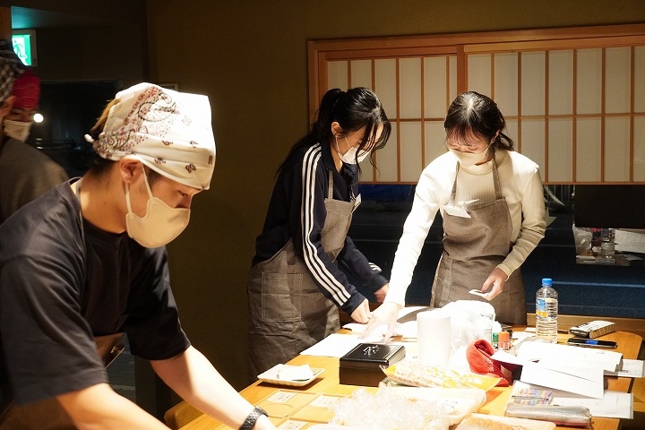 渋屋椥辻本店と木下ゼミが連携し、学生が栄養バランス改善の提案を行った既存のコースメニューと、ナリシングフードとして試作開発したお茶漬け「橘茶膳」をコースの締めとして提供しました。開発にあたっては栄養価分析など、栄養士の監修もいただき、現代人に不足しがちなビタミン、ミネラルの摂取など栄養バランスを踏まえた改善を重ねました。