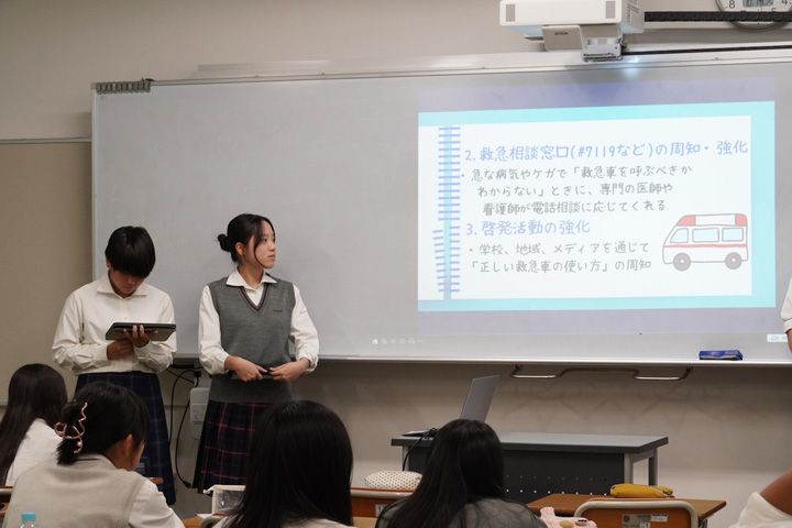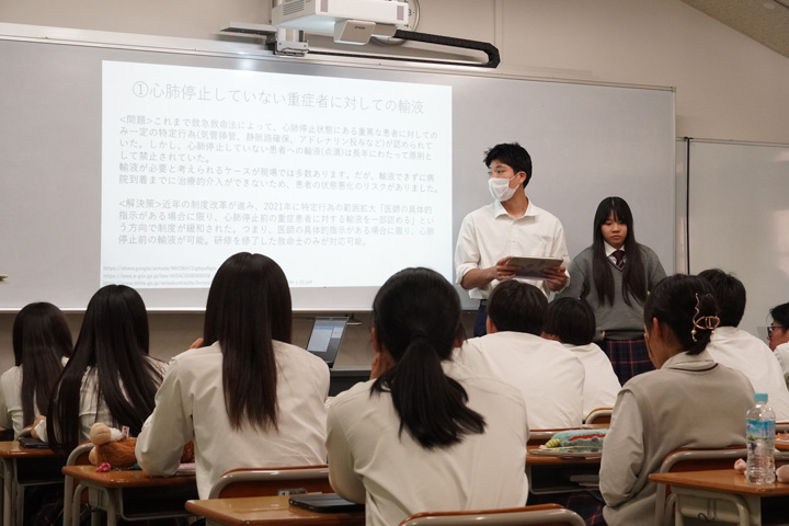 「看護医療入門」クラスは看護医療分野への就職希望者を対象に開講され、「健康科学部救急救命学科」黒﨑久訓先生が講師を務めました。本クラスでは「救急医療の課題と解決策」をテーマに各グループがテーマ設定と調査を行い発表に臨みました。発表では、テーマに関連する最新の制度変更や自治体の取り組み例が取り上げられるなど、黒﨑先生からは「テーマ設定が面白かった、よく調べていたと思います」と講評が行われました。