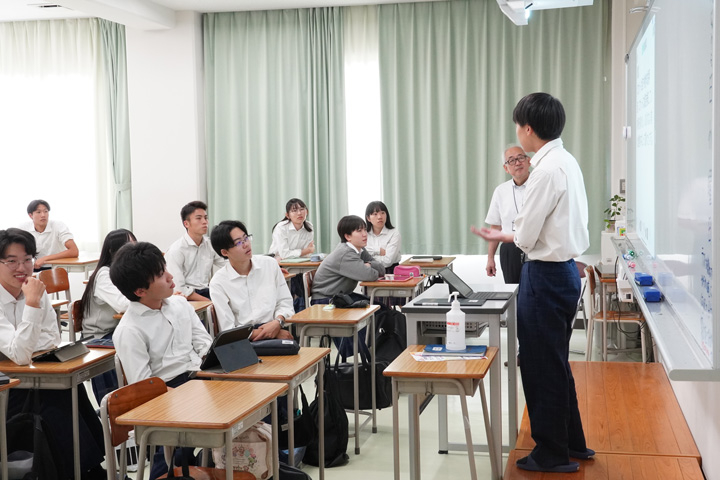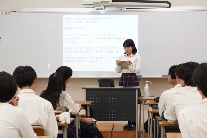 「TachiTech」クラスは理系学部への進学を考えている生徒を対象に開講され、2026年4月開設の「工学部ロボティクス学科」小野哲雄学科長が講師を務めました。「四足歩行ロボの有効活用アイディア」を考え、実際にロボットのプログラミングを組むという課題に対して、各自が発表を行いました。生徒たちはロボットを使用する環境の想定や動作、工夫した点について説明後、実際に自身がプログラミングした通りに動作するか、期待と緊張のまなざしでロボットの動きを見守りました。