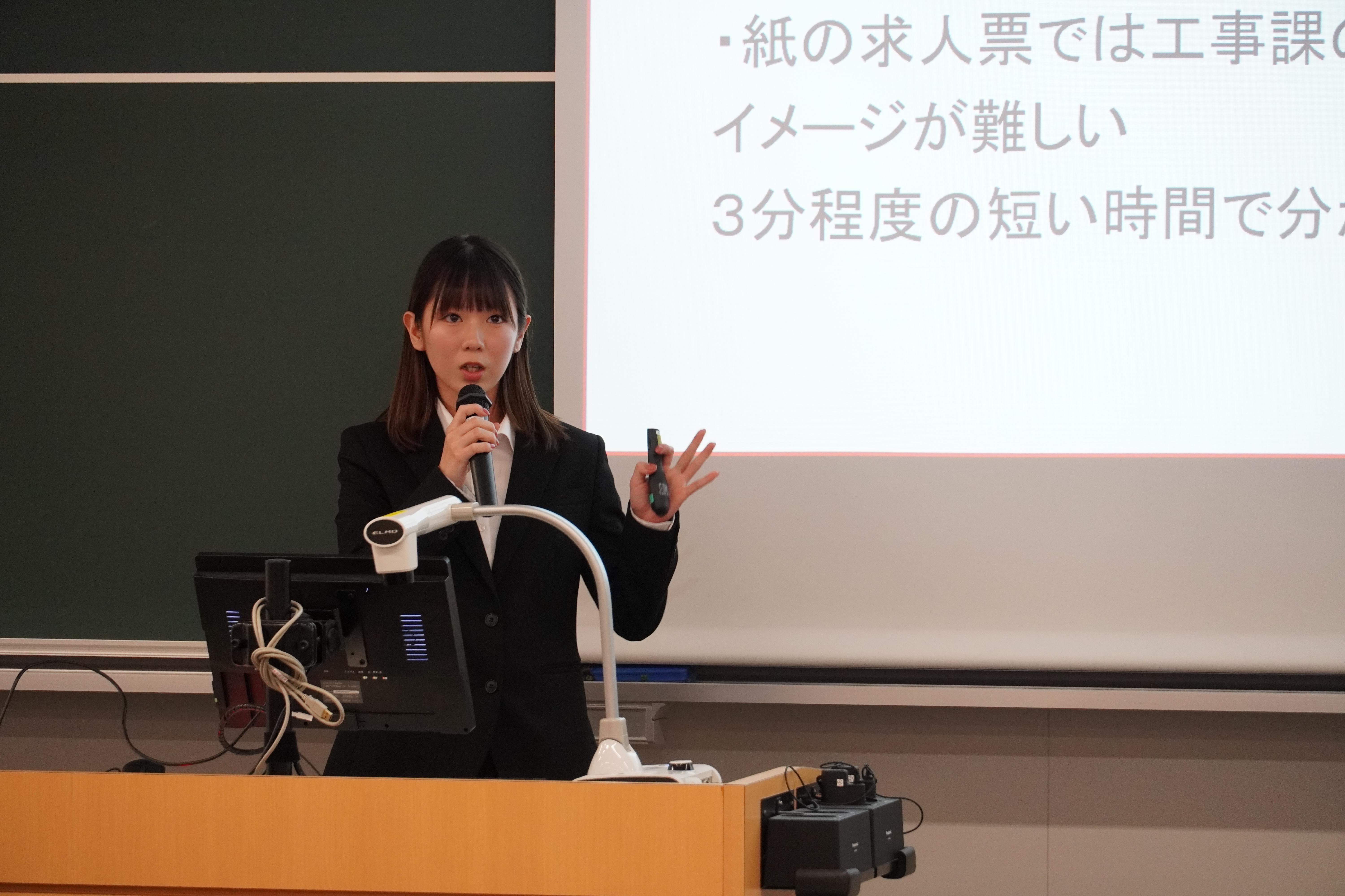 大阪石材工業株式会社で実習を行った山口奈々さんは「墓地や霊園でお墓を建てるという、あまり知られていない職人の仕事を分かりやすく伝え、興味を持ってもらうための動画制作に取り組みました。相手に伝わる作品を作るため、まず職人の仕事への理解を深める努力をしました。また、動画制作の難しさを乗り越えるため、取り組みやすい部分から着手し、作業を進める工夫を行いました。撮影から編集まで一人で担当し、何度も仕上がりを見直して、どうしたら良くなるのか自問自答を繰り返し、改善を重ねたことで、継続的な改善意識が自身の強みだと再認識できました」と話しました。