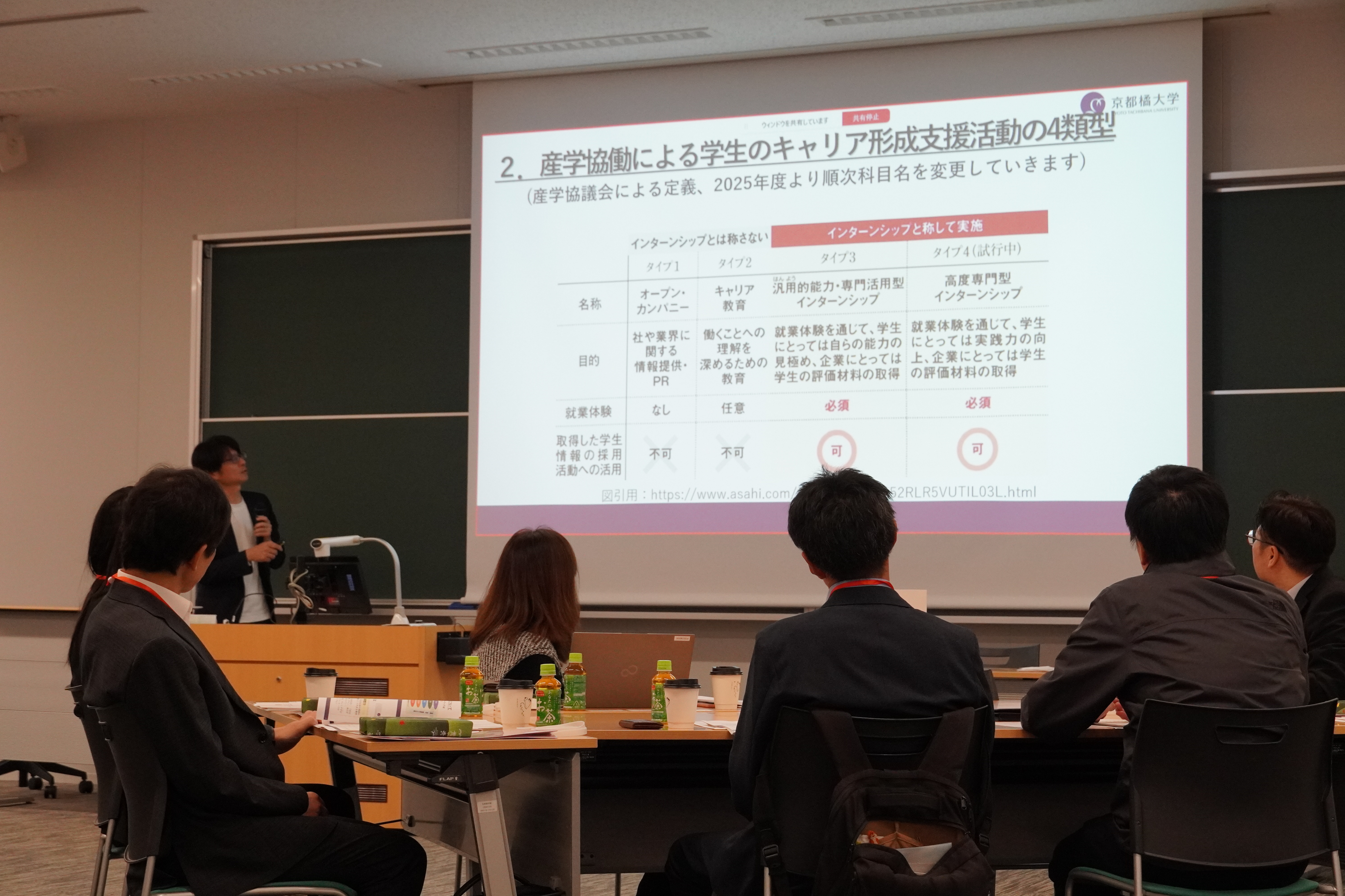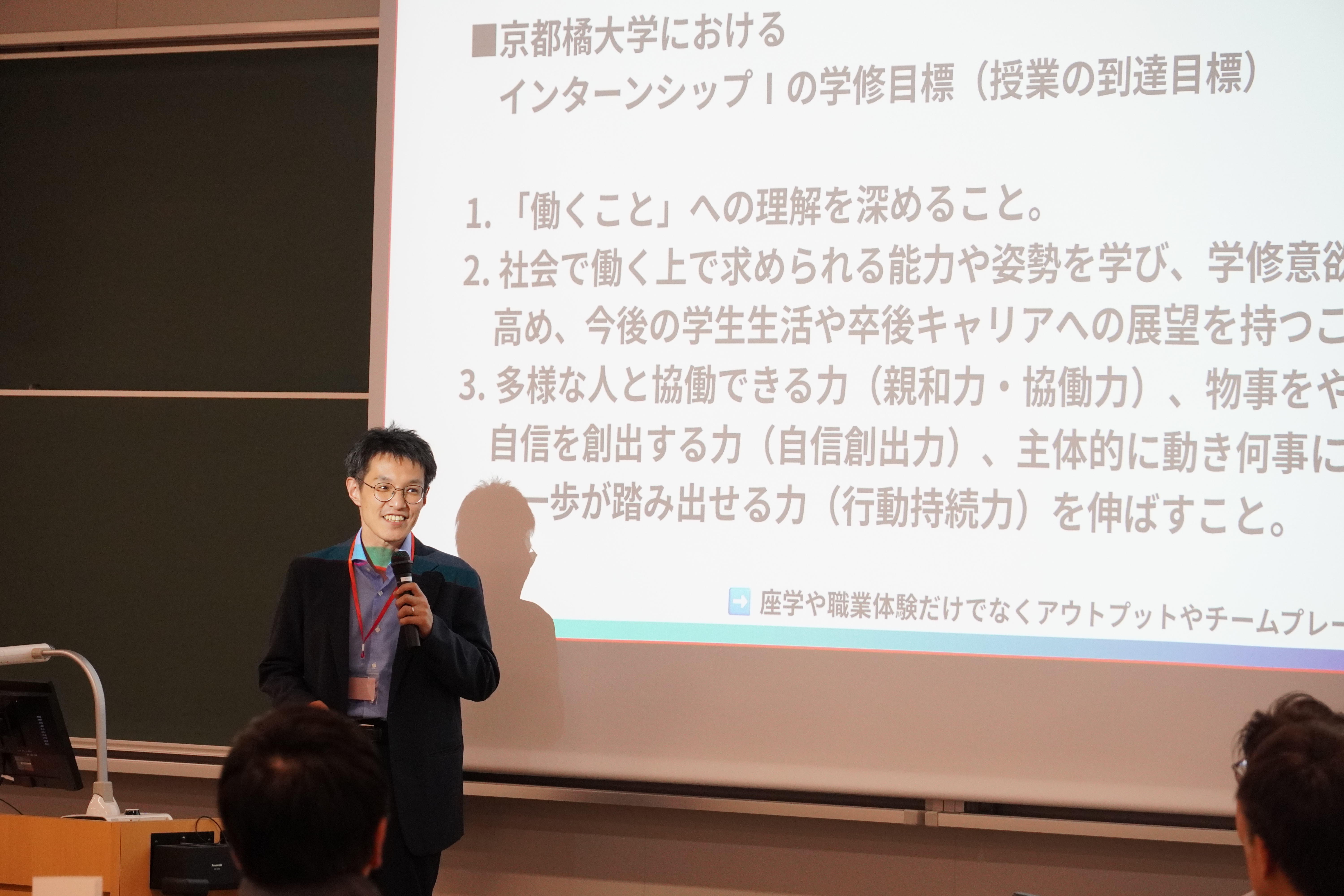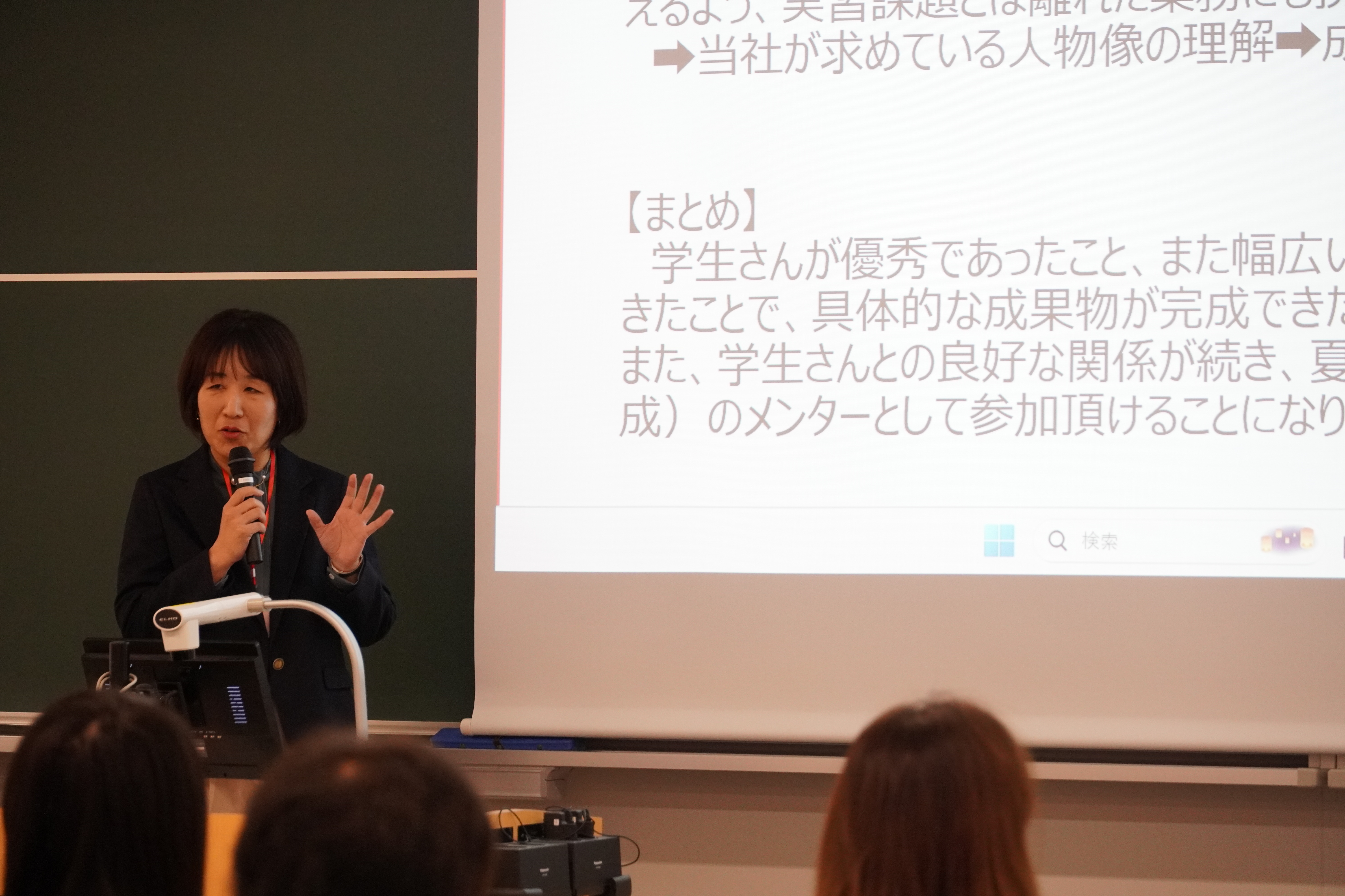 連携先事業所からは、日本梱包運輸倉庫株式会社と大阪石材工業株式会社の2社より実習事例をご紹介いただきました。「伝える」ではなく「伝わる」状況をいかに作り出すかが重要であると強調しつつ、企業の視点から実習プログラムの狙いや工夫、そして学生の成長の様子について報告がなされました。