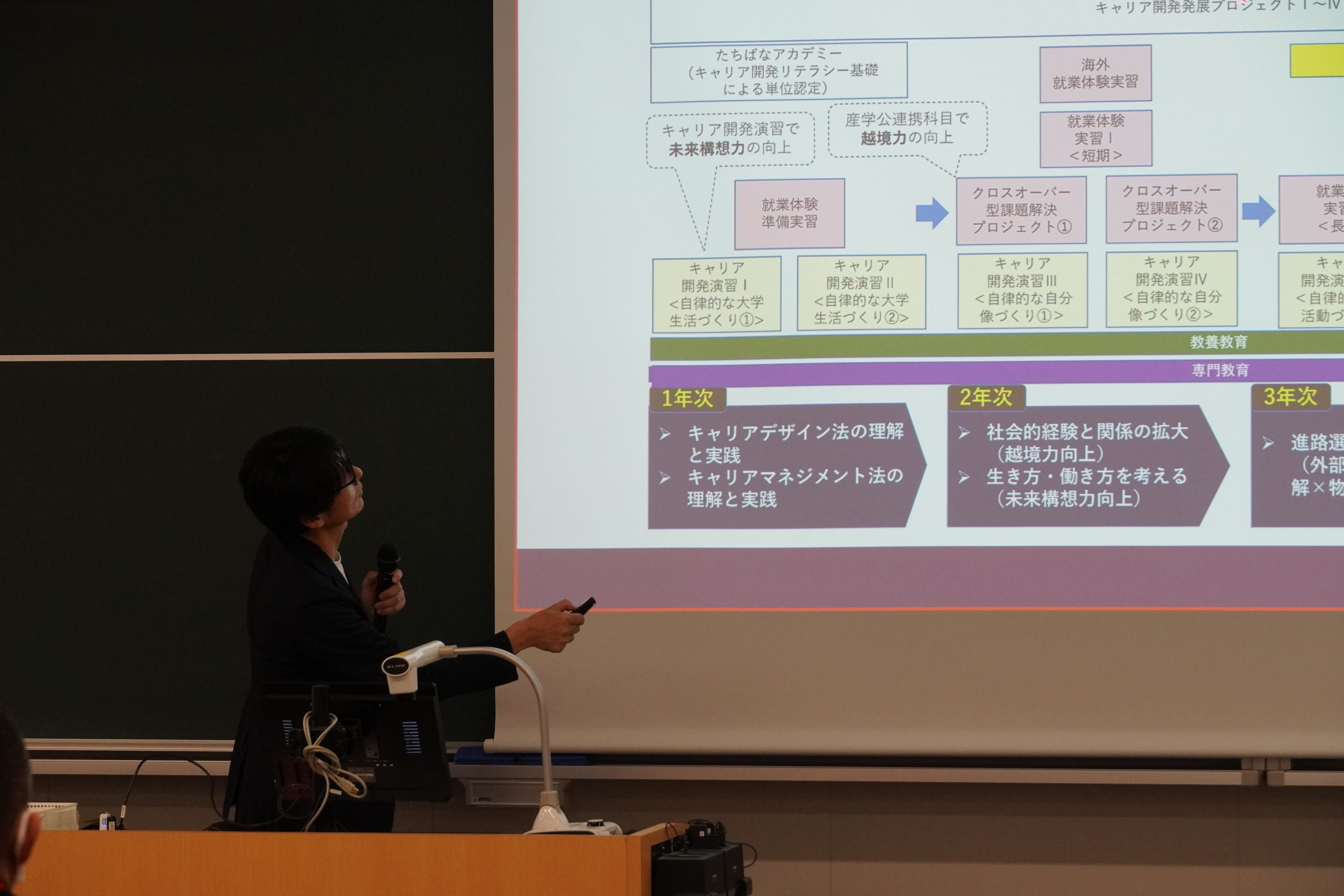 2025年11月5日(水)、本学アカデミックリンクスで2025年 度産学公連携科目 実施報告会・情報交換会を開催しました。本学では、不確実な社会の中で自律的なキャリアを構築できる人材の育成を目指し、社会的学習や越境的学習の機会となる多様な産学公連携教育を展開しています。今回の実施報告会・情報交換会には、今年度産学公連携科目にご協力いただいた連携先事業所をお迎えしました。