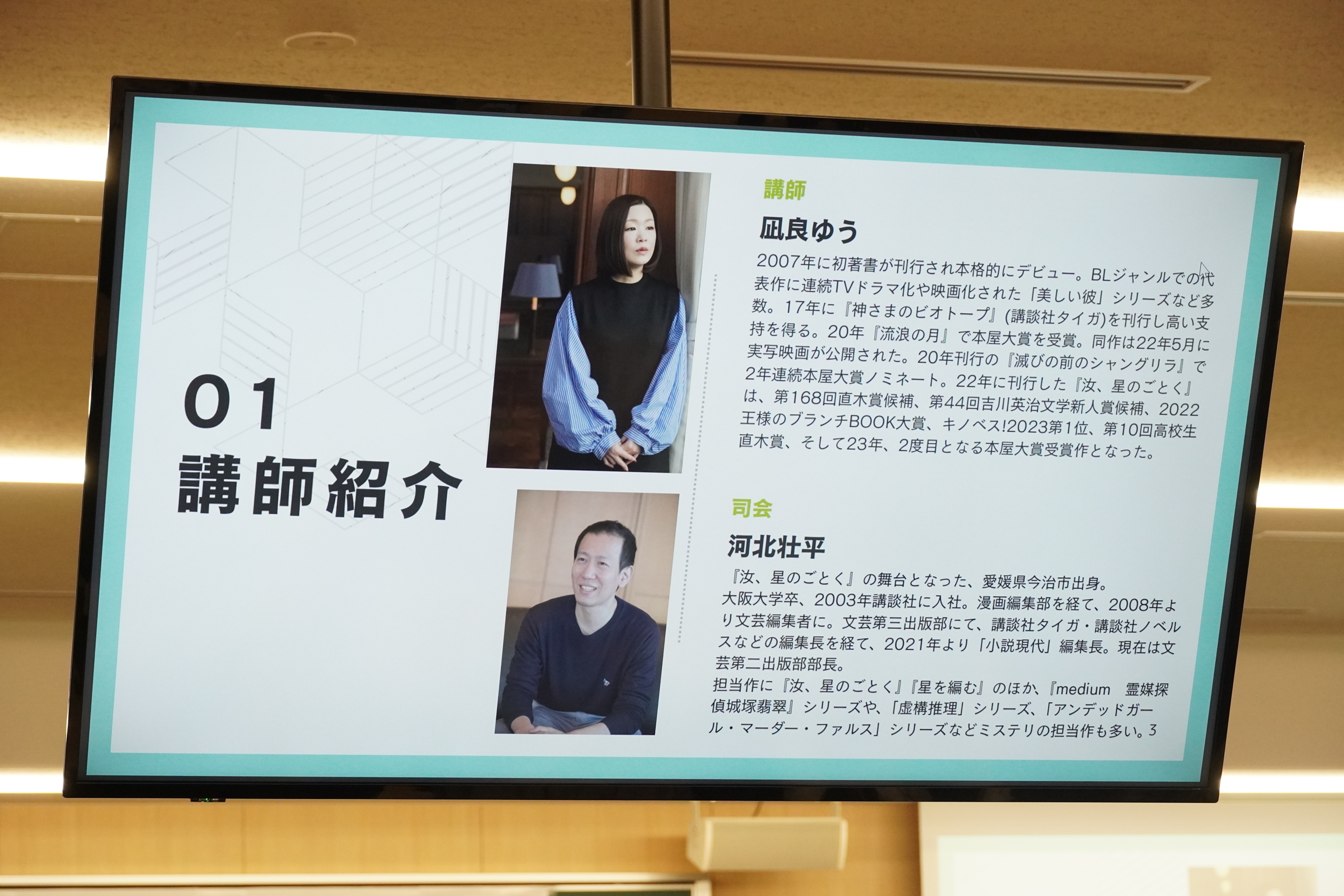 講演会では、小説家の裏側として凪良氏のデビューの経緯や編集者との関係について語られました。担当編集者の河北氏からは、「編集者の仕事は作品を良くするために何でもすること」だと強調され、作家がなんとなく書いた部分を言語化することも編集者の役割だと紹介がありました。また、凪良氏は、自己開示を厭わず作品に深く踏み込んでくれる担当編集者との協働では、良い作品を制作できることが多いと経験談を交えて述べられました。