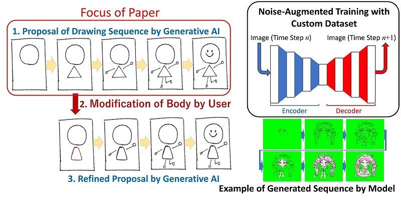 近年、様々な画像生成AIが登場していますが、これらは完成した画像しか生成できず、ユーザーが画像に直接修正を加えることが難しいという課題があります。本研究では、作画過程そのものに介入しながら制作を進められる「作画支援AI」の実現を目指しています。本論文ではその初期モデルとして、描画の進行に合わせて画像を段階的に生成できるAIを構築し、評価しました。本モデルは、画像を圧縮・復元するオートエンコーダモデルを改良したモデルを用い、学習を安定化させるために学習データにノイズを加える手法を導入。自作の10体のキャラクター画像データを用いて画像系列の生成実験を行った結果、最新の時系列画像生成モデルの一種であるPredRNNと比べ、部分的に画像生成性能が上回る結果が得られました。今後は本論文で構築したシステムを改良し、実用的な作画支援AIの実現を目指していきたいと考えています。