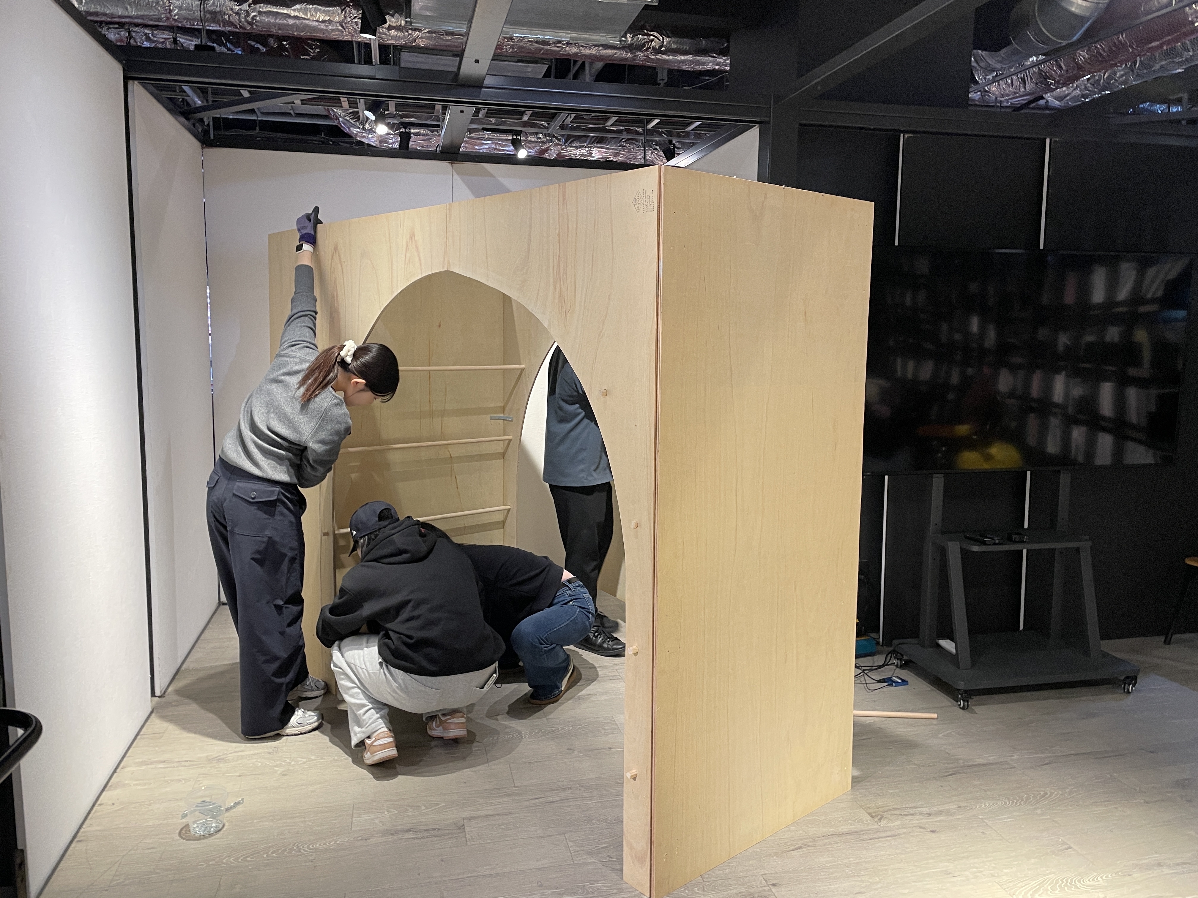 展示スペースの企画立案、制作はすべてゼミに所属する3回生が担当し、今年の3回生9名全員が制作に携わりました。建築を学ぶ中、模型作りは普段から頻繁に行う一方で、実際の材料を使って人間の大きさに近いスケールで組み立てを行う機会は少なく、今回の展示制作は貴重な経験となりました。