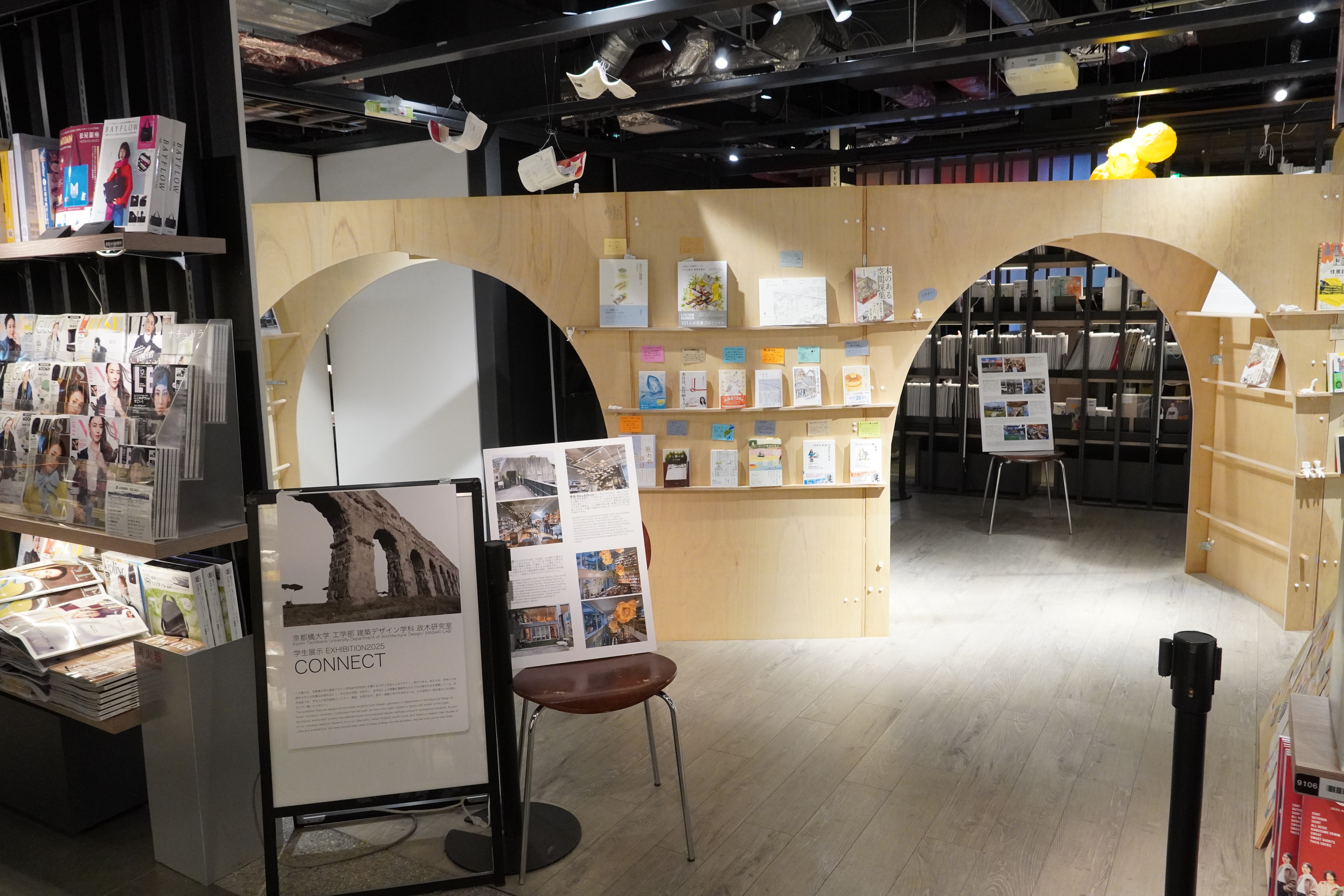 2025年11月26日(水)から28日(金)にかけて、工学部建築デザイン学科専任講師・政木哲也ゼミの学生チームが、下京区の大垣書店京都本店のイベントスペース-催-にて学生展示「CONNECT」を実施しました。
