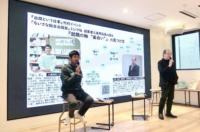 12月5日(金)、「ちいさな総合出版社」として知られるミシマ社の創業者・三島邦弘氏による特別トークショー「就職の軸"面白い"の見つけ方」を開催しました。