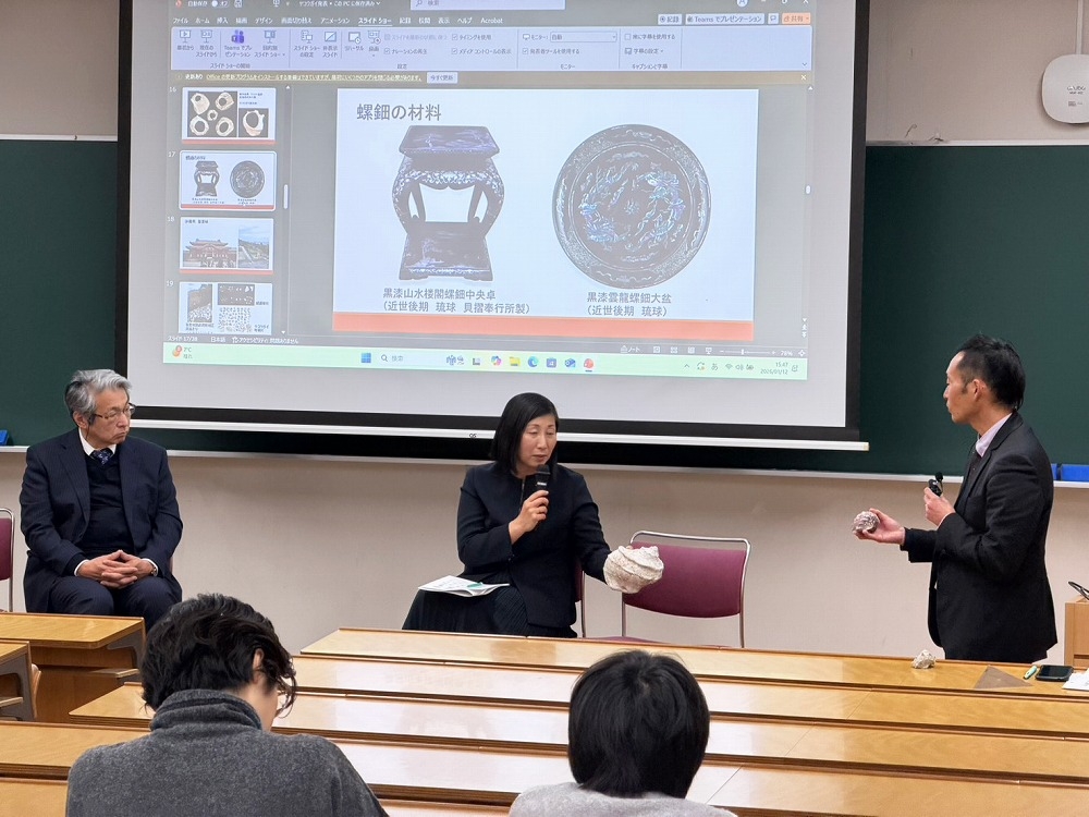 講演会では平安京研究の第一人者である同志社女子大学特任教授の山田邦和氏、琉球列島特産の貝であるヤコウガイを専門にご研究されている岡山県矢掛町教育委員会の西野望氏にご登壇いただき、お二人のご講演終了後に南准教授を交えてパネルディスカッションを行いました。山田氏からは平安京の移り変わりに関する最新の調査研究成果、西野氏からは奄美大島を中心としたヤコウガイの利用方法や交易の具体像についてお話いただきました。