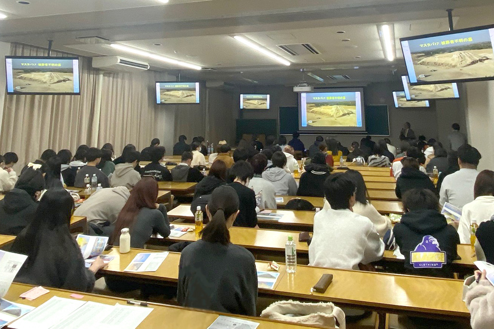 大城氏は、エジプトでの調査の際に撮影した写真や動画を示しながら、ピラミッドの構造の時代的変遷や、その形状をめぐる論争など、さまざまなトピックについて語られました。当日は歴史学科、歴史遺産学科の学生約100人が参加し、講演会後に設けられた質疑応答の時間では、次々と学生から質問が挙がり、活発な議論がおこなわれました。