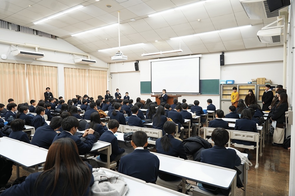 本授業は、音羽中学校の生徒が「山科の街をよりよくするためのアイデア」をテーマに企画・検討した内容を、本学「まちづくり研究会」の学生に向けて発表し、大学生からのフィードバックを通じて学びを深めることを目的としたものです。当日は、音羽中学校1年生約170名と教員の皆さまが来学されました。