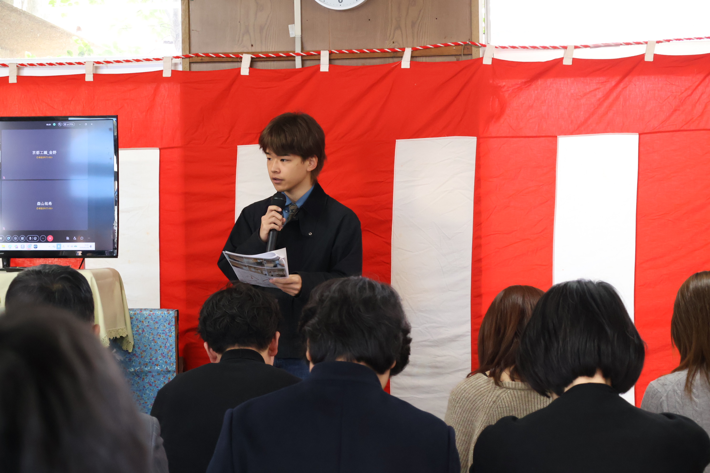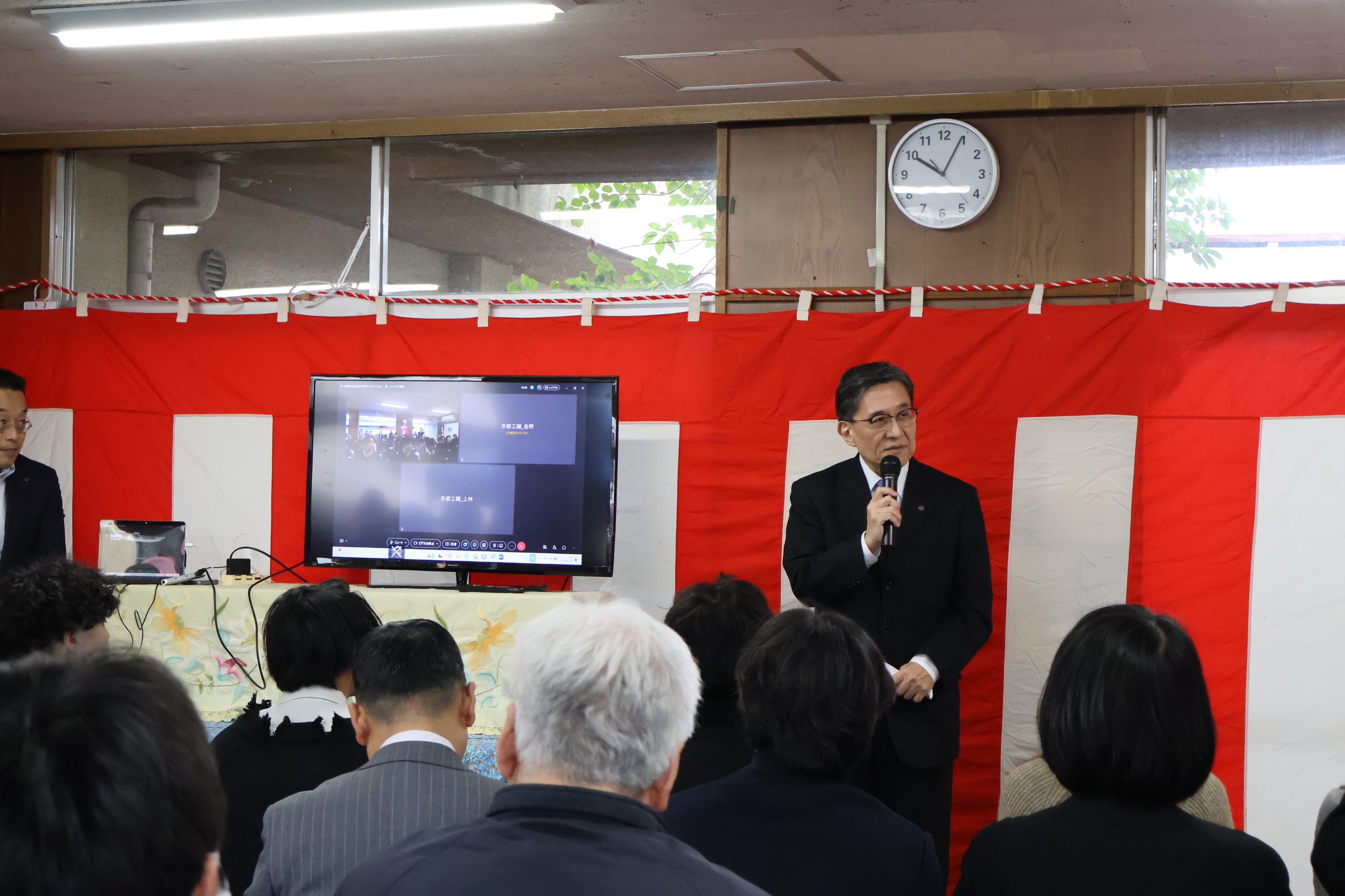 2026年2月28日(土)には、リノベーション住戸の完成に伴い「リノベーション住戸完成式典・内覧会」が開催されました。式典では、本プロジェクトの主催者である京都福祉サービス協会 宮路理事長と、京都市の松井市長による挨拶が行われました。続いて、本学が担当した住戸について、学生が来場者に向けて改修のポイントや工夫した点を説明しました。
