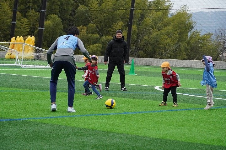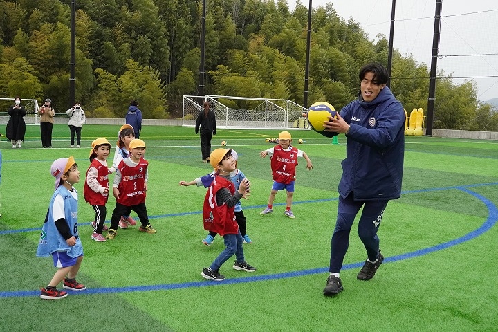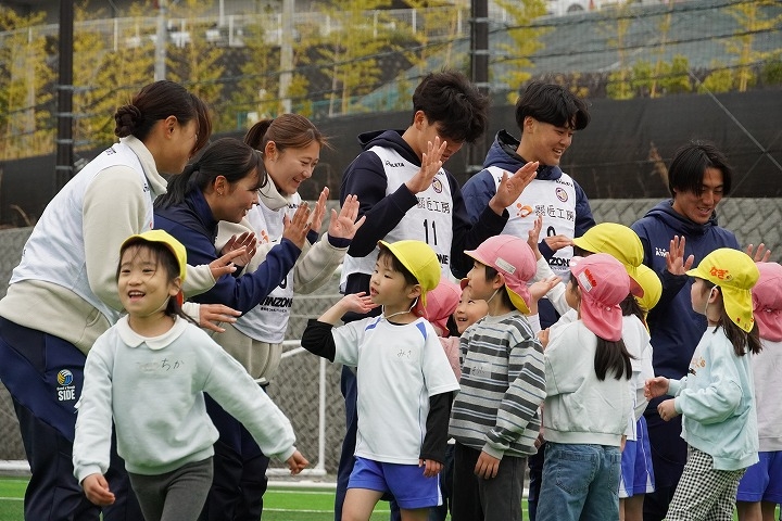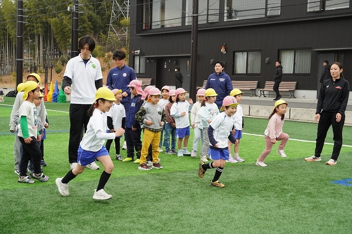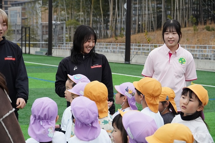 2026年3月25日(水)、KYOTO TACHIBANA スタジアムにて本学の強化クラブに所属する学生と、たちばな大路こども園の子どもたちによる交流会を実施しました。当日はサッカー部、陸上競技部(女子短距離系)、女子バレーボール部(ビーチバレーボール部門)、弓道部、吹奏楽部の学生が参加し、園児たちと一緒に体を動かしながら交流を深めました。