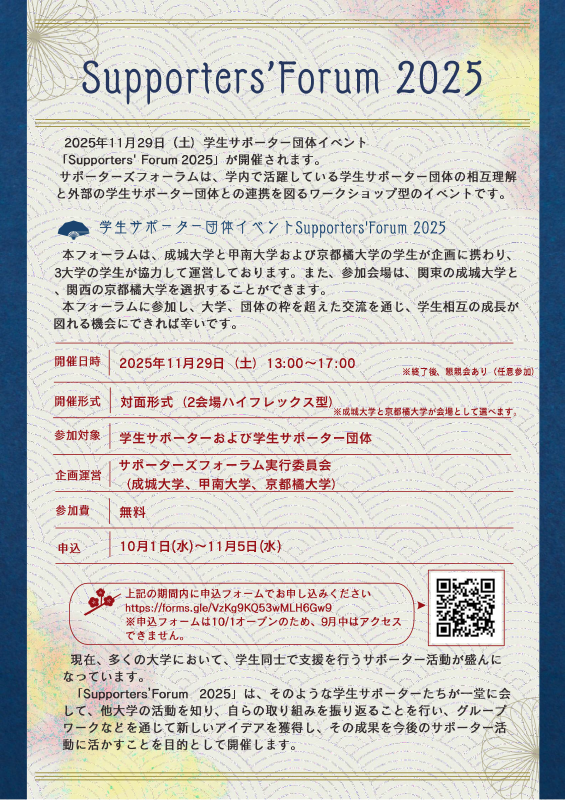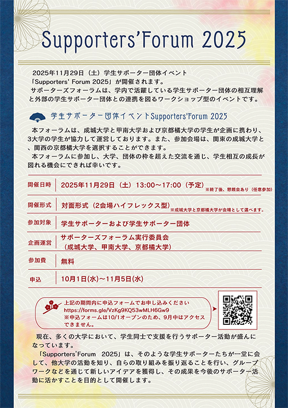 2025年11月29日(土)に京都橘大学で、学生サポーター団体イベント「Supporters'Forum 2025」が開催されます。